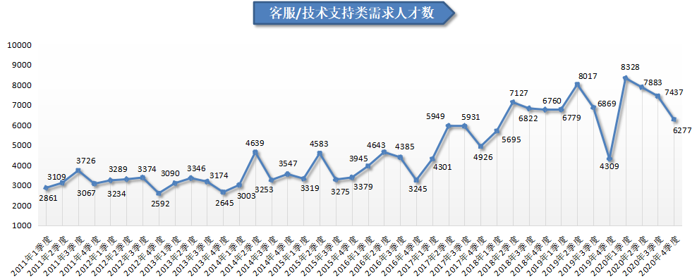 1.客服/技术支持类职位人才需求同比大幅增长