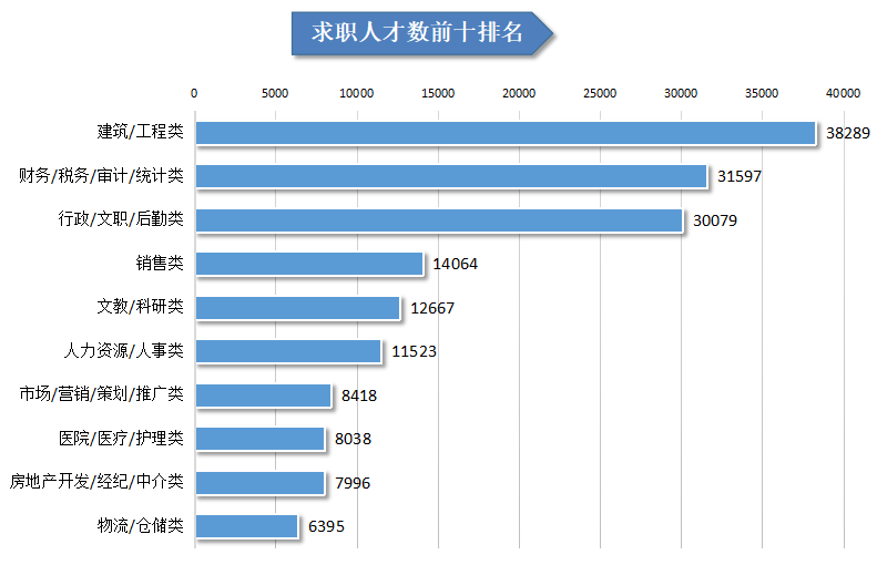 位居求职榜前十名的职位:建筑/工程类、财务/税务/审计/统计类、行政/文职/后勤类、销售类、文教/科研类、人力资源/人事类、市场/营销/策划/推广类、医院/医疗/护理类、房地产开发/经纪/中介类、物流/仓储类等职位类型。这十个职位类型的求职人才数量总计169066人,合计占比达到54.30%。其中,建筑/工程类、财务/税务/审计/统计类以及行政/文职/后勤类这三类职位类型的求职人才数稳居前三位,均超过30000人。