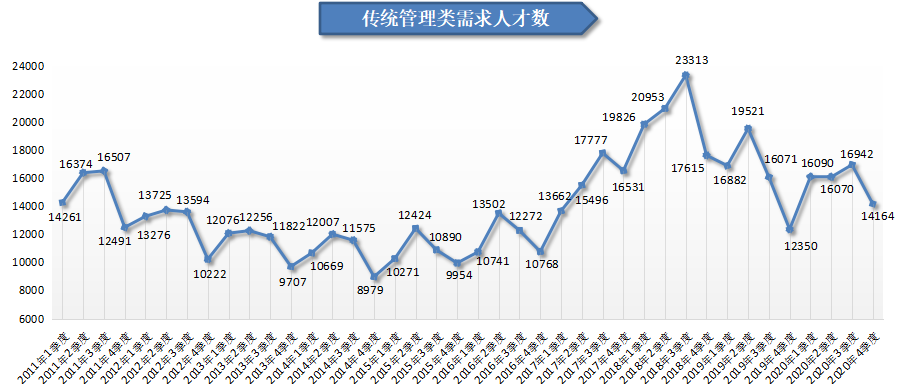 2020年第四季度,广西人才网中传统管理类职位(包含行政/文职/后勤类、人力资源/人事类及财务/税务/审计/统计类等职位类别,下同)的人才需求总量呈季节性回落,为14164人,环比下滑16.40%,但与上年同期相比仍增加1814人,同比增长14.69%。其中人力资源/人事类、行政/文职/后勤类以及财务/税务/审计/统计类的人才需求与上年同期相比分别增加了1269人、401人和144人,同比涨幅分别为50.52%、6.72%和3.72%。