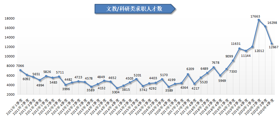 2020年第四季度,广西人才网中文教/科研类职位的求职人才数为12667人,比上年同期增加1523人,同比增长13.67%。