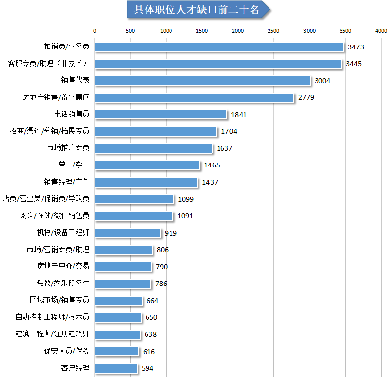 在用人单位最急需人才的前二十名具体职位中,销售类、市场/营销/策划/推广类等业务类人才最为紧缺,占最急需人才将近八成。其中,推销员/业务员、客服专员/助理(非技术)以及销售代表等职位分列前三名,这三个职位人才供给量较为缺乏,人才缺口(即需求人才数与求职人才数的差额,下同)分别达到3473人、3445人以及3004人。