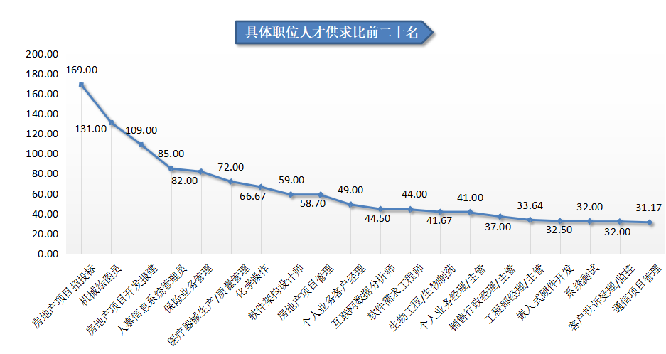 在具体职位中,房地产项目招投标、机械绘图员、房地产项目开发报建等职位竞争较为激烈,由于需求极少,这三个职位的人才供求比分别高达169.00、131.00以及109.00,均超过100人竞争1个岗位,竞争激烈程度遥遥领先。