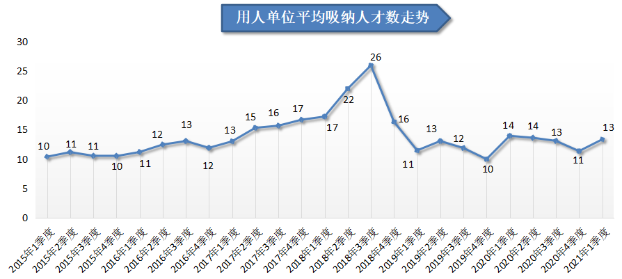 近七年各季度用人单位平均吸纳人才数量曲线图(单位:人/家):