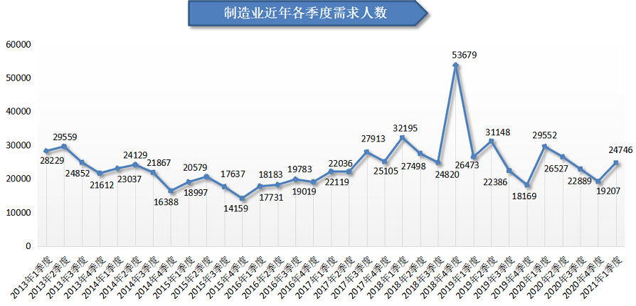 2021年第一季度,广西人才网中制造业需求人才数为24746人,比上年同期的29552人减少4806人,同比下滑16.26%。其中,医药/医疗器械/医疗机构行业人才需求出现较大下滑,其需求人才数为6288人,与上年同期相比减少了3673人,降幅为36.87%。
