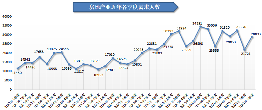 2021年第一季度,房地产业需求人才数为28833人,是目前人才需求量最大的行业类别,与上年同期的31820人相比减少2987人,同比下滑9.39%。其中,房地产开发经营行业人才需求萎缩是导致房地产行业人才需求下滑的主要原因,其需求人才数为9559人,与上年同期相比减少了2470人,降幅为20.53%。