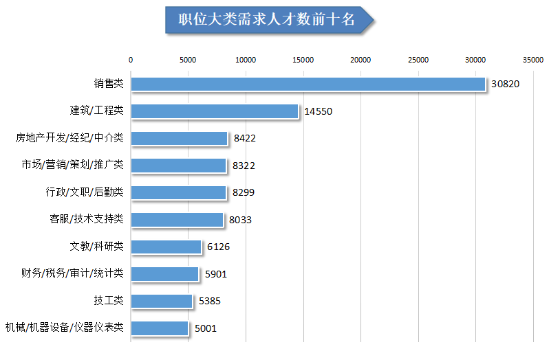 同时,在54个主要职位类别中,有7个职位类别存在人才缺口(即需求人才数与求职人才数的差额,下同),主要集中在销售类、客服/技术支持类等职位中。其中,销售类人才缺口为15171人、客服/技术支持类人才缺口为2282人。