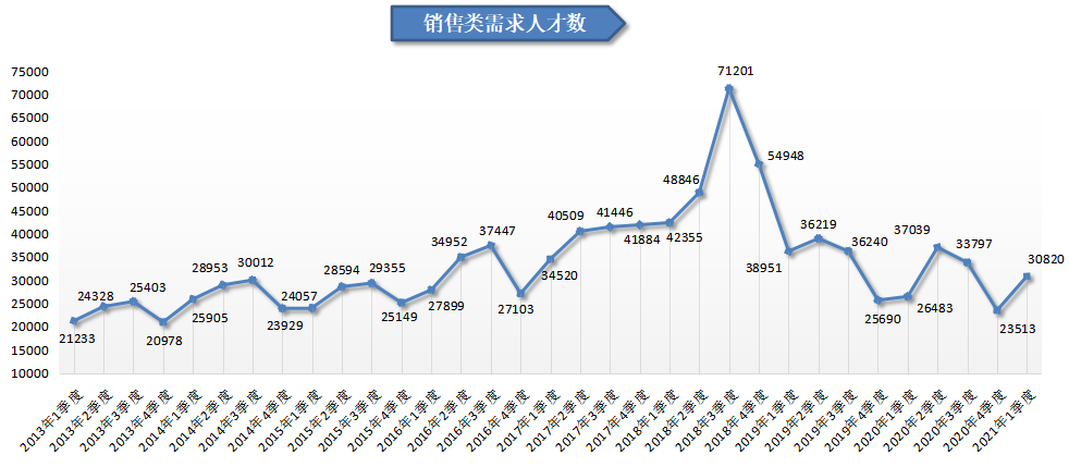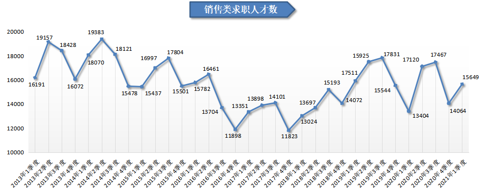 2021年第一季度,广西人才网中销售类职位的求职人才数为15649人,与上年同期的13404人相比增加2245人,同比增长16.75%,环比增长11.27%,人才供给有所回升。