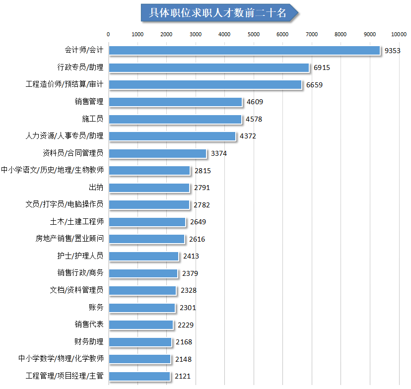 在具体职位中,会计师/会计、行政专员/助理、工程造价师/预结算/审计等职位较受求职者青睐,求职人才数均超过6000人,求职人才数分别为9353人、6915人和6659人。