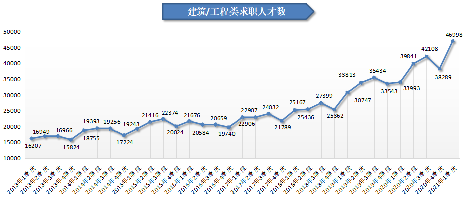 2021年第一季度,广西人才网中建筑/工程类职位的求职人才数创历史新高,为46998人,与上年同期相比增加13005人,同比增长38.26%,是本季度人才供应量最多的职位类型。
