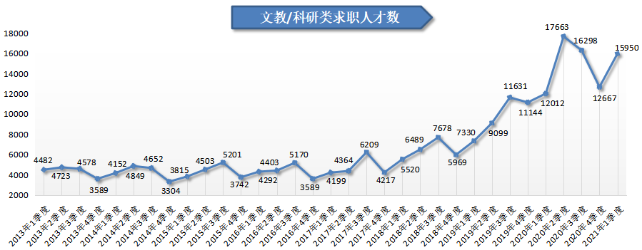 2021年第一季度,广西人才网中文教/科研类职位的人才供应量同比增长较明显,其求职人才数为15950人,与上年同期的12012人相比增加3938人,同比增长32.78%。