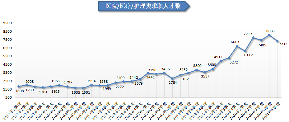 2021年第一季度,广西人才网中医院/医疗/护理类职位的求职人才数为7312人,与上年同期的6112人相比增加1200人,同比增长19.63%,但低于前三季度的求职人数,稍显回落态势。
