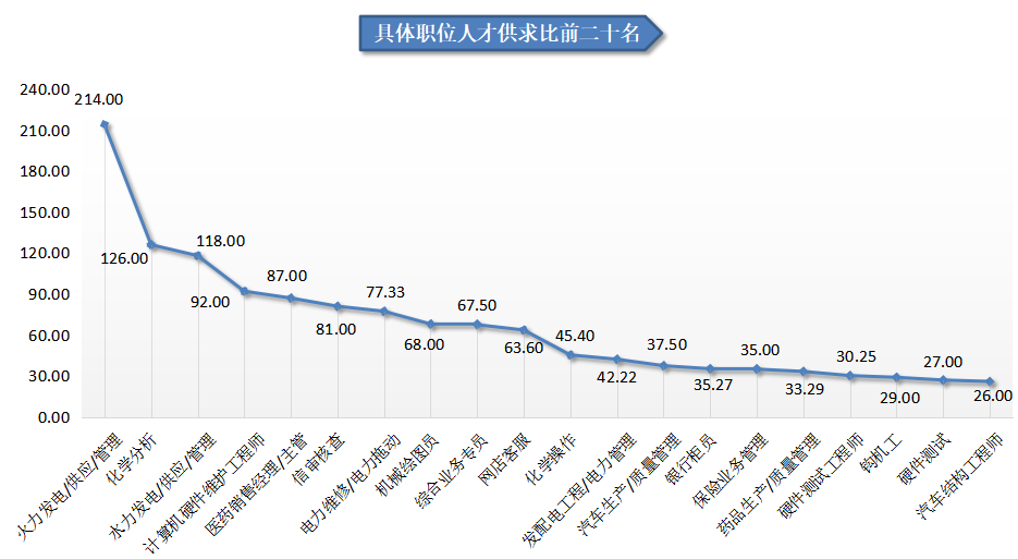 从具体职位看,在人才竞争激烈程度的前二十名具体职位中,由于需求极少,最高供求比高达214.00,达到214人竞争1个岗位;第二十名的职位供求比也达到26.00。
