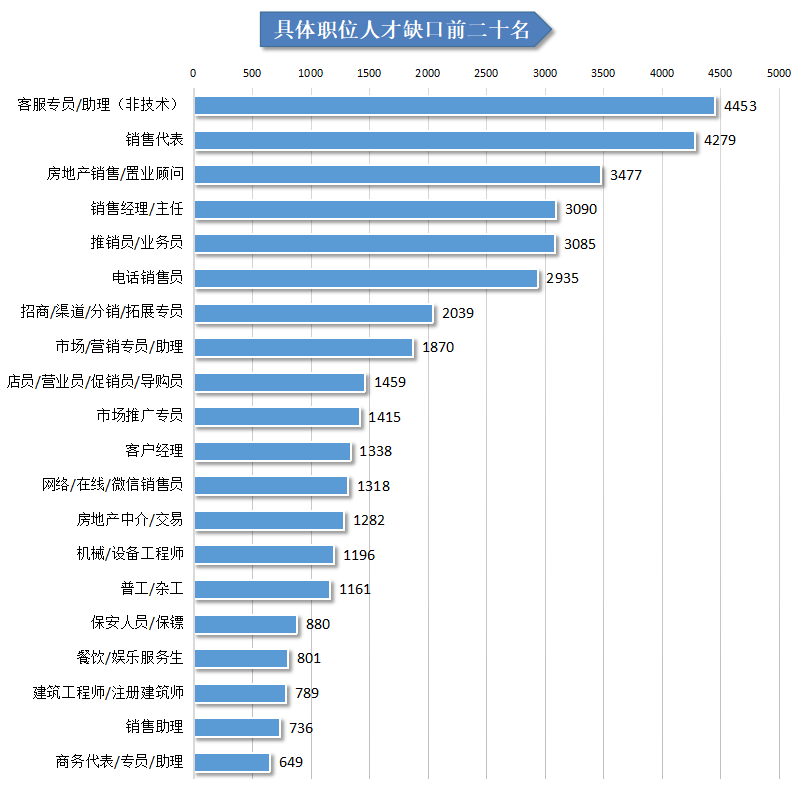 在用人单位最急需人才的前二十名具体职位中,销售类、市场/营销/策划/推广类等业务类人才最为紧缺,有八成职位与业务挂钩,其中客服专员/助理(非技术)、销售代表职位人才缺口较明显,这两个职位人才缺口分别达到4453人及4279人。
