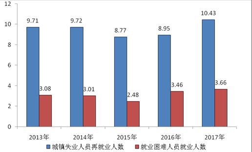 图3 近五年城镇失业人员再就业及就业困难人员就业人数 单位:万人