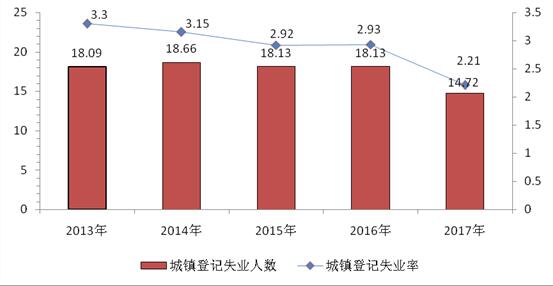 图4 近五年城镇登记失业人数及登记失业率 单位:万人,%