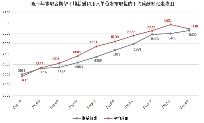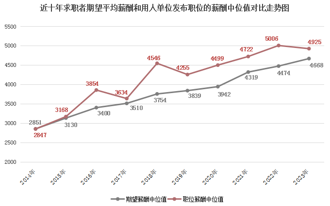 近十年求职者期望薪酬和用人单位发布职位薪酬中位值对比走势图如下: