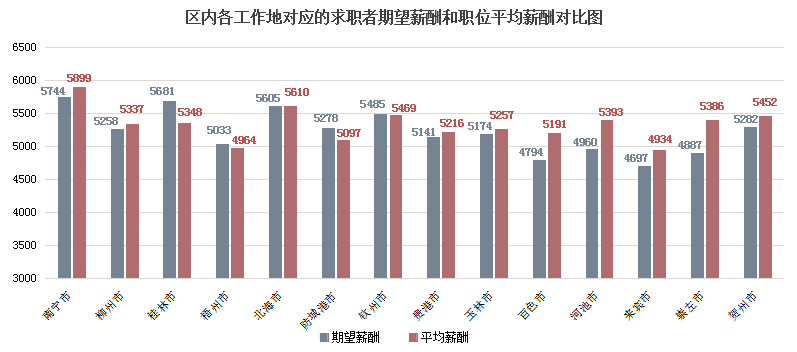 广西人才网中各工作地对应的求职者期望薪酬和职位平均薪酬如下图(单位:元/月):