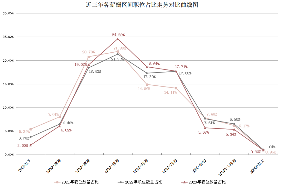具体来说,低薪职位占比逐年下滑。在2000以下元/月的区间,职位数量的比例呈现了较为明显的下降趋势,从2021年的5.39%下降到了本年度的2.00%,减少了3.39个百分点;2000-2999元/月薪酬区间职位占比从2021年的8.01%下降到了本年度的6.05%,减少了1.96个百分点。与此同时,高薪职位占比也整体下滑。在8000-9999元/月的区间,职位占比为5.68%,比2022年减少了1.93个百分点;另外,10000以上元/月的区间,职位合计占比为6.27%,比2022年减少了1.27个百分点。
