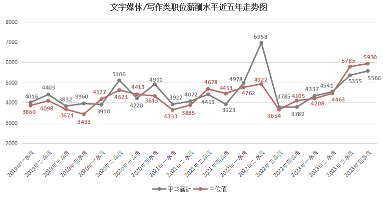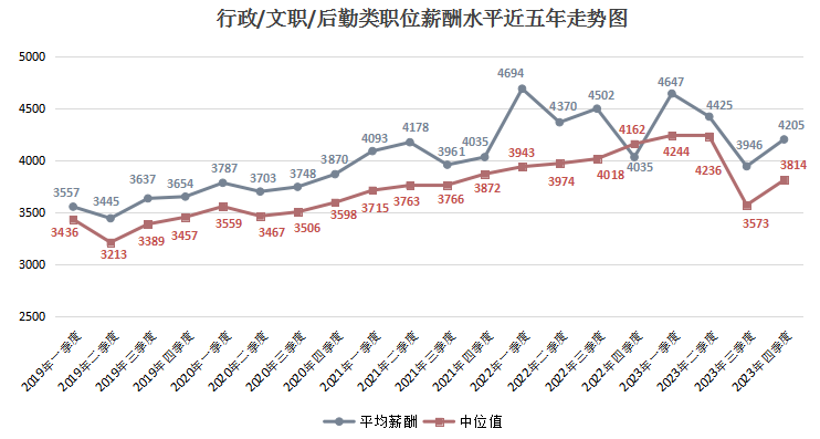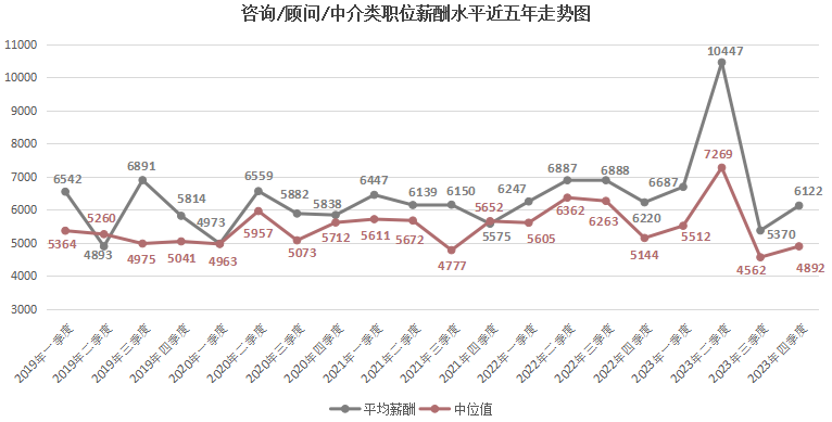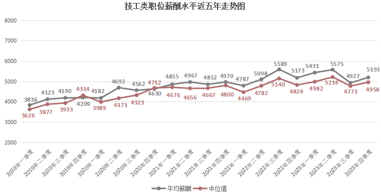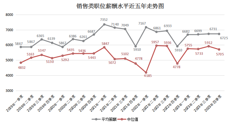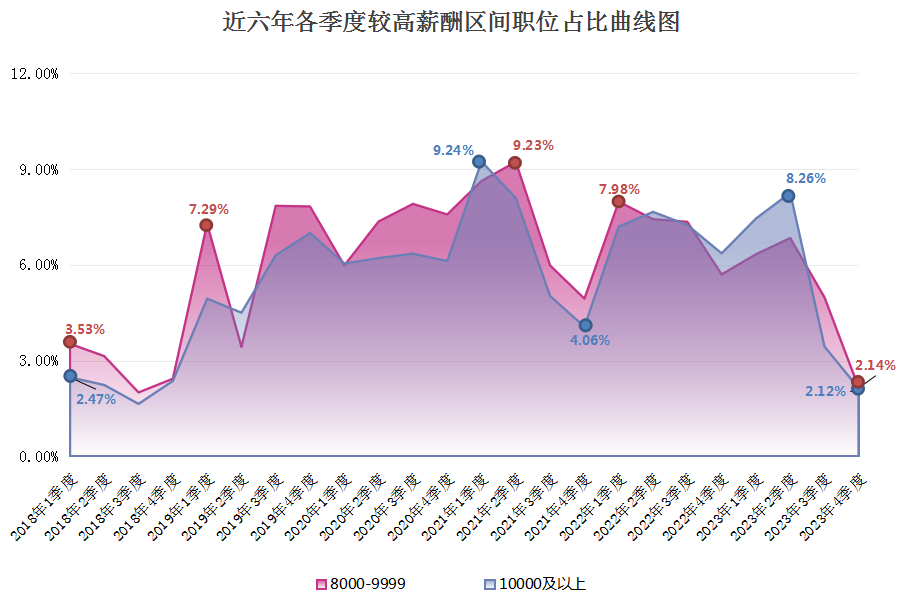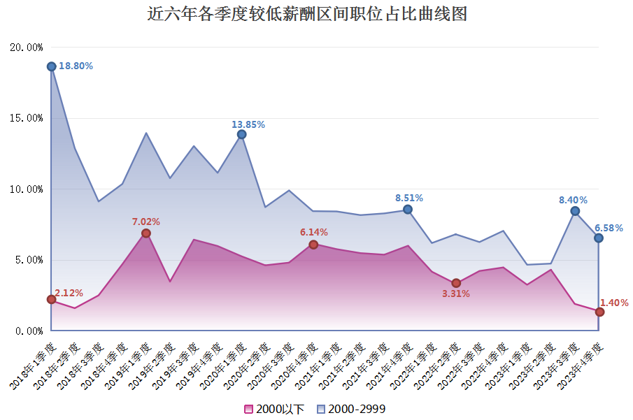 由上图可见,近六年2000以下元/月薪酬区间逐年下滑,尤其是在2023年第四季度,该区间的职位数量占比仅为1.40%,这是近六年来的最低值。而2000-2999元/月薪酬区间虽然在某些季度有季节性增长,但整体上也有下滑趋势,在2023年第四季度,该区间的职位数量占比为6.58%。