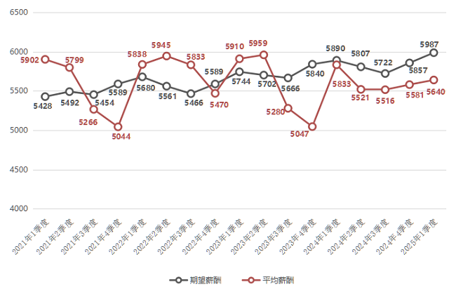 近五年求职者期望薪酬和用人单位发布职位平均薪酬对比走势图如下: