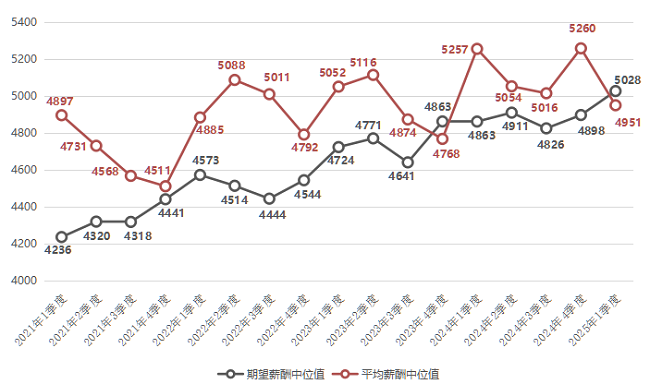 近五年求职者期望薪酬和用人单位发布职位薪酬中位值对比走势图如下: