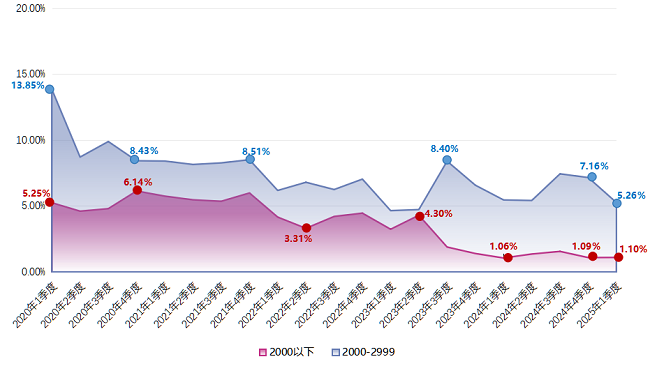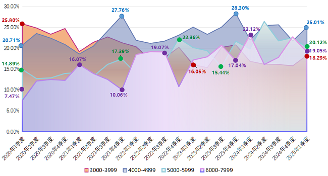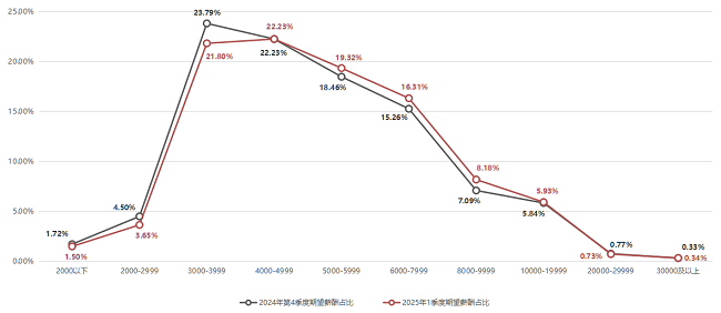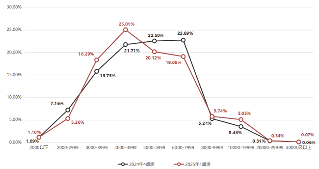 2025年第一季度,求职者期望的薪酬区间占比保持平稳,整体呈现出正偏态分布的特征,其中,3000-3999元/月区间和4000-4999元/月区间的求职者期望薪酬占比均超过两成。