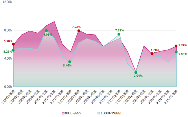 本季度职位薪酬区间占比主要集中在4000-4999元/月区间、5000-5999元/月区间、6000-7999元/月区间以及3000-3999元/月区间,占比分别为25.01%、20.12%、19.05%和18.29%。整体来看,3000-3999元/月区间、4000-4999元/月区间的职位占比增长较为明显,分别比上季度增加了2.54个百分点和3.30个百分点。然而,本季度降幅最大的薪酬区间是6000-7999元/月区间,环比下降了3.64个百分点。此外,8000以上元/月的各高薪区间占比均呈现不同程度的增长,其中10000-19999元/月区间占比增长较大,占比为5.03%,环比增长1.55个百分点。