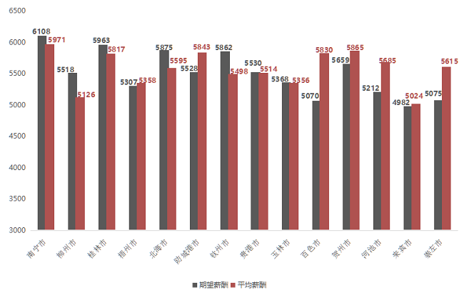广西人才网中区内主要工作地对应的求职者期望薪酬和职位平均薪酬水平分布图如下(单位:元/月):