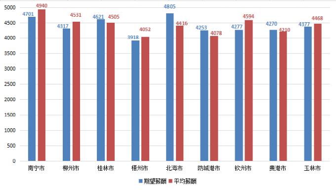 广西人才网联系统中区内主要工作地对应的求职者期望薪酬和职位平均薪酬水平分布图如下(单位:元/月):