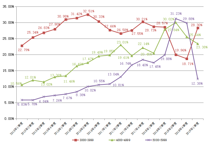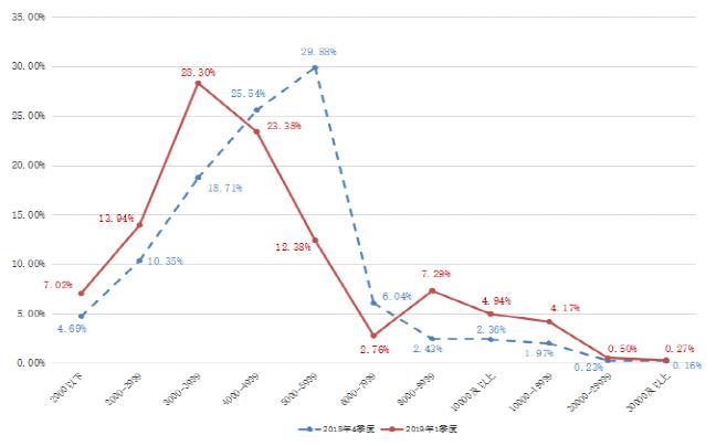由上图可见,2019年第一季度3000-3999元/月区间的职位数量占比出现回升,由上季度的18.71%增至本季度的28.30%,增长9.59个百分比,再次成为占比最为集中的薪酬区间;4000-4999元/月和5000-5999元/月两个区间职位数量占比均呈现不同程度的下滑,与上季度相比分别下滑2.16和17.50个百分点。