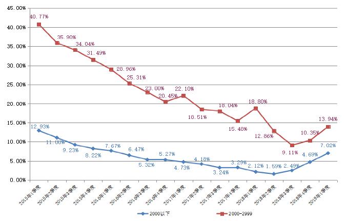 由上图可见,近五年2000元/月以下和2000-2999元/月较低薪酬区间虽然2019年第一季度职位数量占比均稍有回升,但占比仅为7.02%和13.94%。