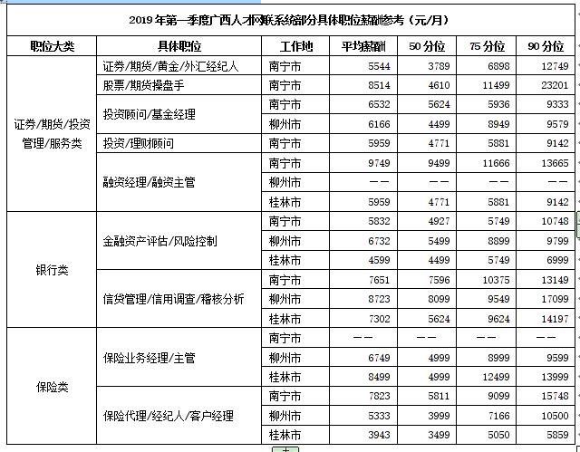 2019年第一季度广西人才网联系统金融类职位用人单位提供的该类部分具体职位薪酬水平见下表: