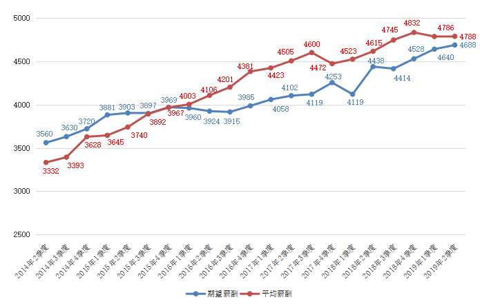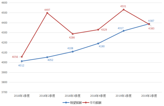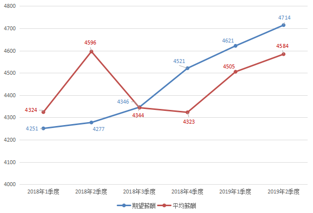 近六年各季度求职者期望薪酬和用人单位发布职位平均薪酬对比走势图如下: