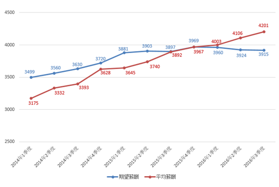 近三年各季度求职者期望平均薪酬和用人单位发布职位的平均薪酬对比走势图如下: