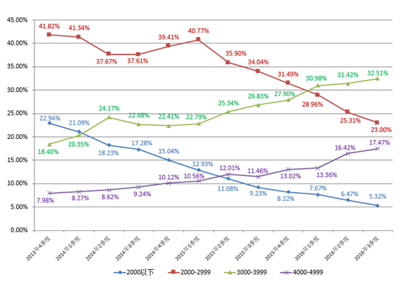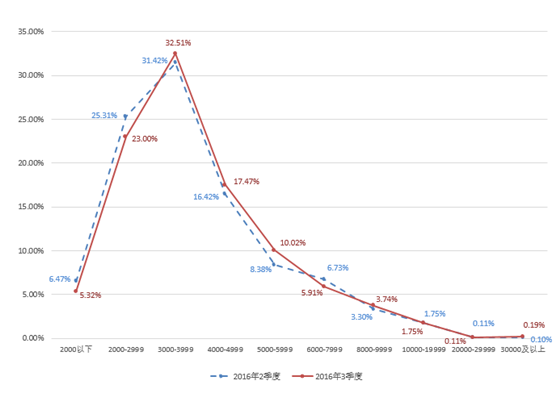 2016年三季度广西人才网联系统中用人单位发布职位的平均薪酬(其定义见注4,下同)为4201元/月,环比涨2.30%,而求职者期望平均薪酬为3915元/月,环比微跌0.22%。用人单位提供的职位平均薪酬水平比求职者的平均期望薪酬略高。