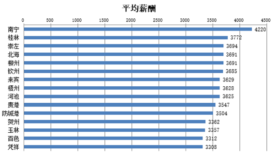 如上图所示,2016年在广西人才网联系统中各市的用人单位提供的薪酬水平分布中,工作地在南宁市的用人单位提供的职位平均薪酬水平最高,达到4220/月,比上年度增长3.59%;工作地在桂林市的用人单位提供的职位平均薪酬水平仅次于南宁市,达到3772/月,比上年度增长6.66%;工作地在来宾市的用人单位提供的职位平均薪酬水平达到3629/月,同比涨幅达到18.53%。