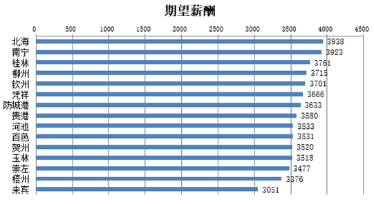 如上图所示,期望在北海市工作的求职者对薪酬要求最高,其期望平均薪酬达到3938/月,期望在南宁市工作的求职者对薪酬的要求位居第二,达到3923/月。