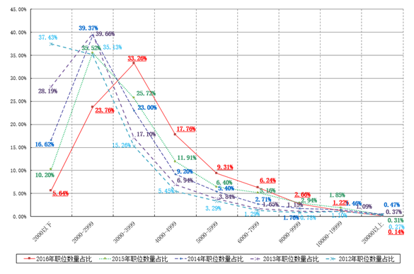 如上图所示,近五年来曲线明显后移,职位平均薪酬水平呈现逐年上涨趋势。其中2000元以下/月区间的职位数量占比由2012年的37.43%降至本年度的5.64%,减少31.79个百分点;2000-2999/月区间的职位数量比例也呈现了非常明显的下降趋势,其职位数量占比为23.76%,比2015年减少11.76个百分点;而3000-3999/月区间职位占比为33.26%,已正式取代2000-2999/月占据主导地位,近五年来持续增长。