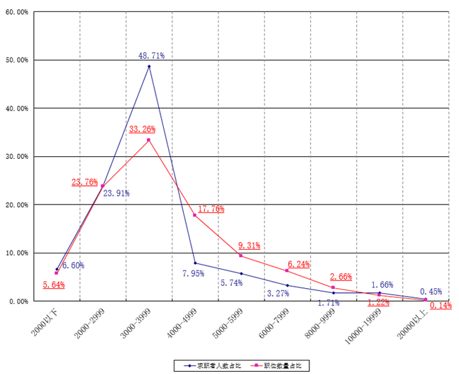 如上图所示,求职者和职位数量最多的区间为3000-3999/月,这个区间共有48.71%的求职者和33.26%的职位数量,彻底取代2000-2999/月区间,成为广西人才网联系统分布最普遍的薪酬范围;另外在2000-2999/月区间中,仍旧集中了23.91%的求职者和23.76%的职位数量。