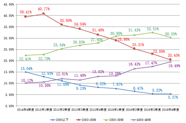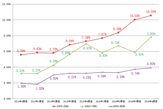 由上图可见,近两年较高薪酬的职位数量占比继续呈现比较明显的上升势头,其中5000-5999/月和8000-9999/月这两个区间的职位数量占比稳步增长,尤其5000-5999/月区间增长幅度较为明显,2016年第四季度占比已达到10.55%;而6000-7999/月区间的职位数量占比波动较大,2016年第四季度占比达到7.82%。