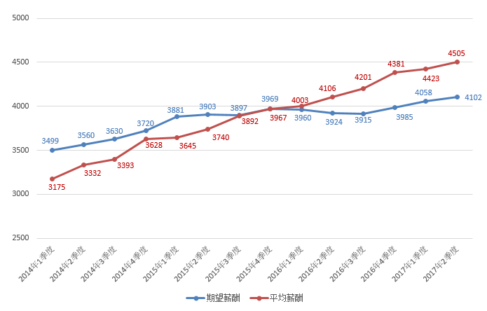 近三年各季度求职者期望平均薪酬和用人单位发布职位的平均薪酬对比走势图如下: