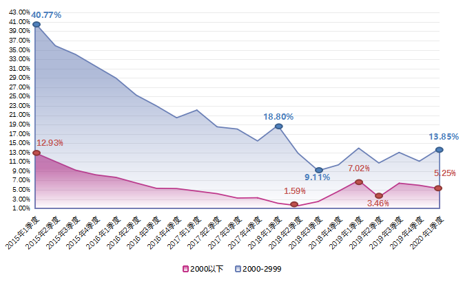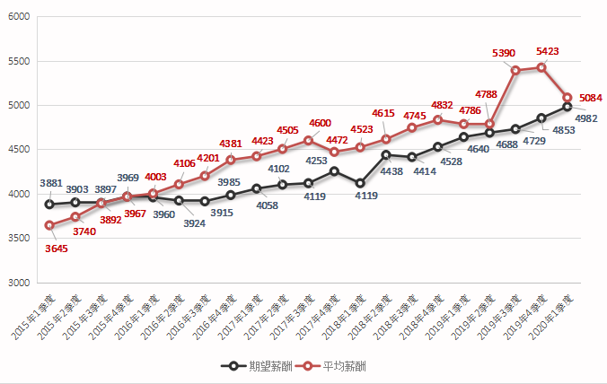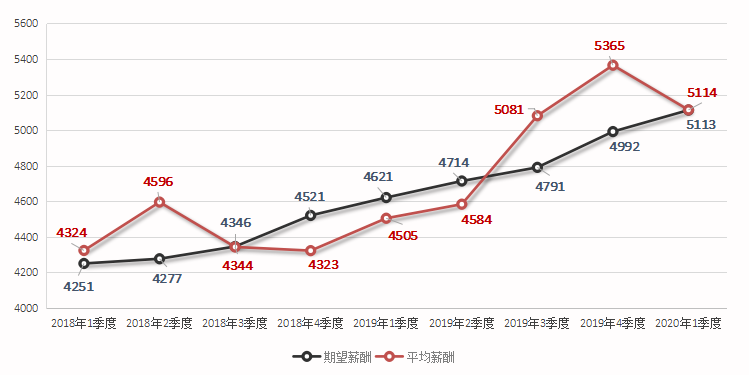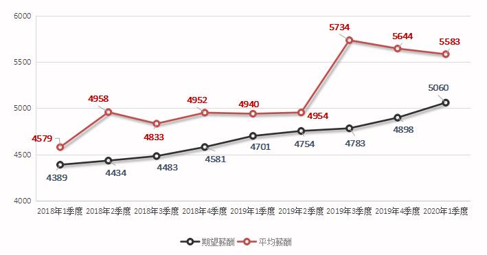 近六年各季度求职者期望薪酬和用人单位发布职位平均薪酬对比走势图如下: