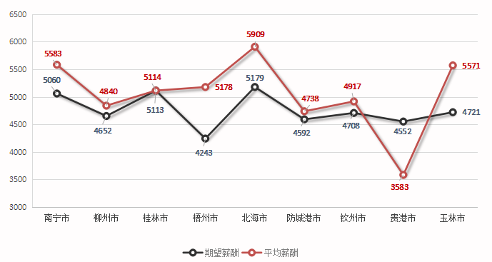 广西人才网中区内主要工作地对应的求职者期望薪酬和职位平均薪酬水平分布图如下(单位:元/月):