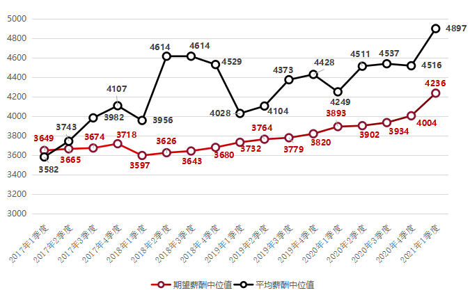 近五年求职者期望薪酬和用人单位发布职位薪酬中位值对比走势图如下:
