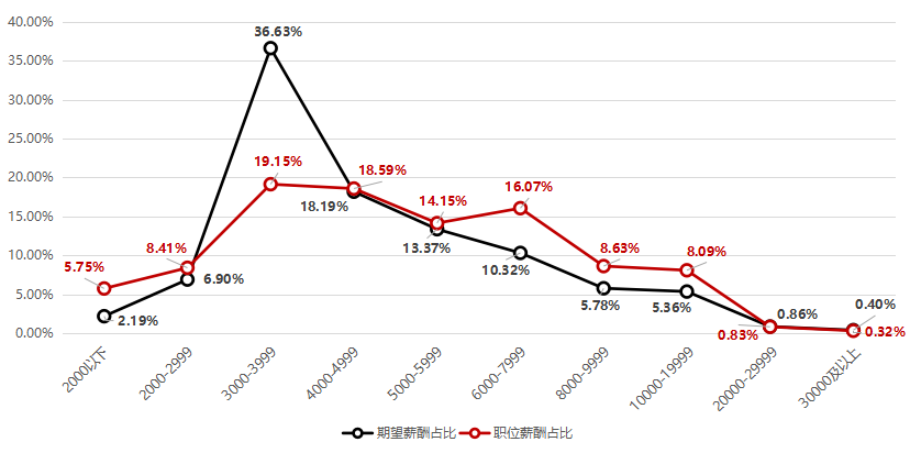 注4:职位平均薪酬指的是所属职位类别中用人单位发布职位的薪酬样本加权平均值,不代表单个职位的实际薪酬,例如高级管理类职位平均薪酬为16480元/月,但其有很多副总以上级别的高薪职位薪酬更高。期望薪酬指的是求职者期望从事职位类别的薪酬样本加权平均值。