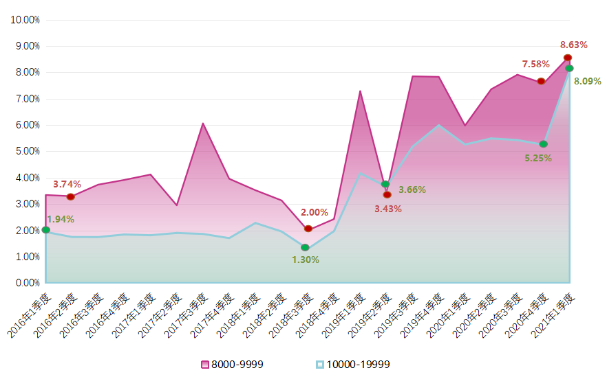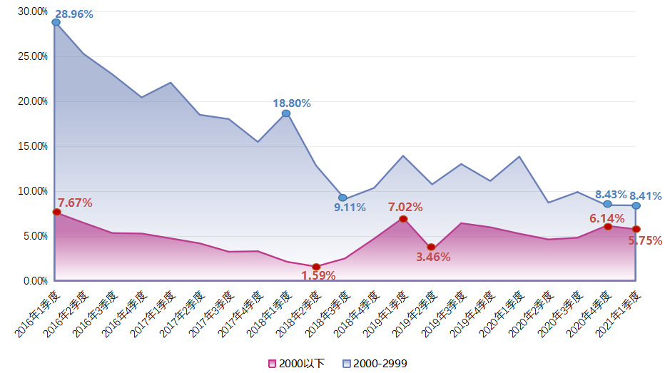 上个季度职位薪酬区间占比仍主要集中在3000-3999元/月和4000-4999元/月这两个区间,占比分别达到24.68%和20.86%。而进入2021年一季度,这两个区间职位占比出现不同程度下滑,3000-3999元/月薪酬区间职位占比为19.15%,环比下降5.53个百分点;4000-4999元/月区间薪酬的职位占比为18.59%,环比下降2.27个百分点;而6000-7999元/月区间异军突起,职位占比达到16.07%,环比上升3.8个百分点。总体而言6000-19999元/月区间职位比重增加明显,主流薪酬区间职位占比有前移趋势。