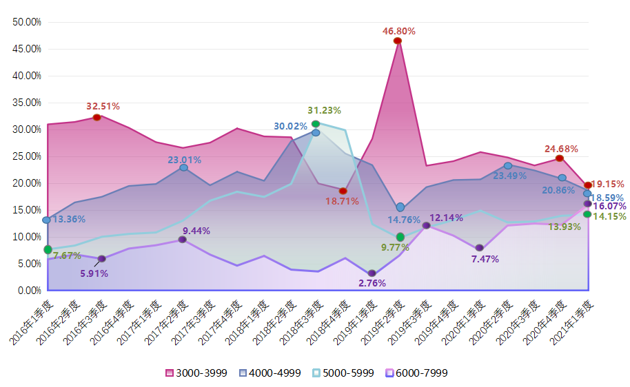 2021年一季度,求职者期望整体分布变化比较平稳,但值得注意的是有4000元成为求职者期望占比增减变化的分水岭,低薪期望占比持续下降,高薪期望占比整体上升。其中3000-3999元/月区间集中有36.63%的求职者,仍是广西人才网求职者期望最集中的薪酬区间。