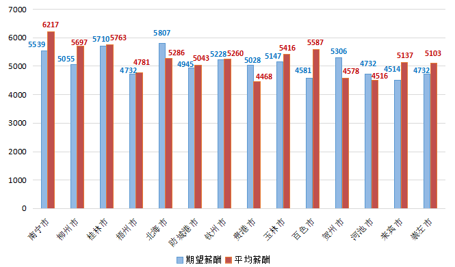 广西人才网中区内主要工作地对应的求职者期望薪酬和职位平均薪酬水平分布图如下(单位:元/月):
