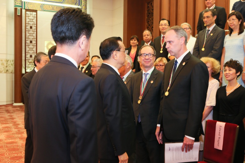 图为国务院总理李克强在人民大会堂亲切会见荣获2017年度中国政府友谊奖的外国专家和他们的亲属。国务院总理李克强(左二)亲切会见爱德华(左四)