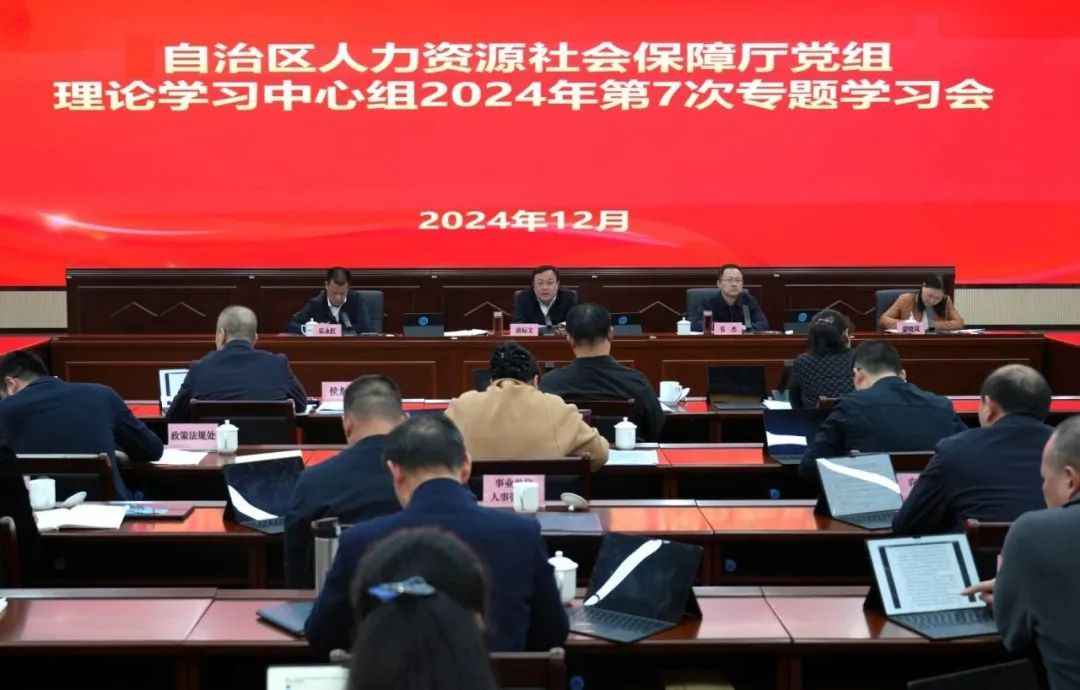 12月26日,自治区人力资源社会保障厅召开党组理论学习中心组2024年第7次专题学习会议,深入学习贯彻党的二十大和二十届二中、三中全会精神,习近平总书记关于广西工作论述的重要要求,习近平总书记系列重要讲话、重要指示批示精神。厅党组书记、厅长唐标文主持会议并作研讨发言及学习小结,厅党组成员、副厅长韦杰,厅党组成员、副厅长、一级巡视员乐永红,驻厅纪检监察组组长、厅党组成员蒙晓岚先后领学并作学习研讨发言。